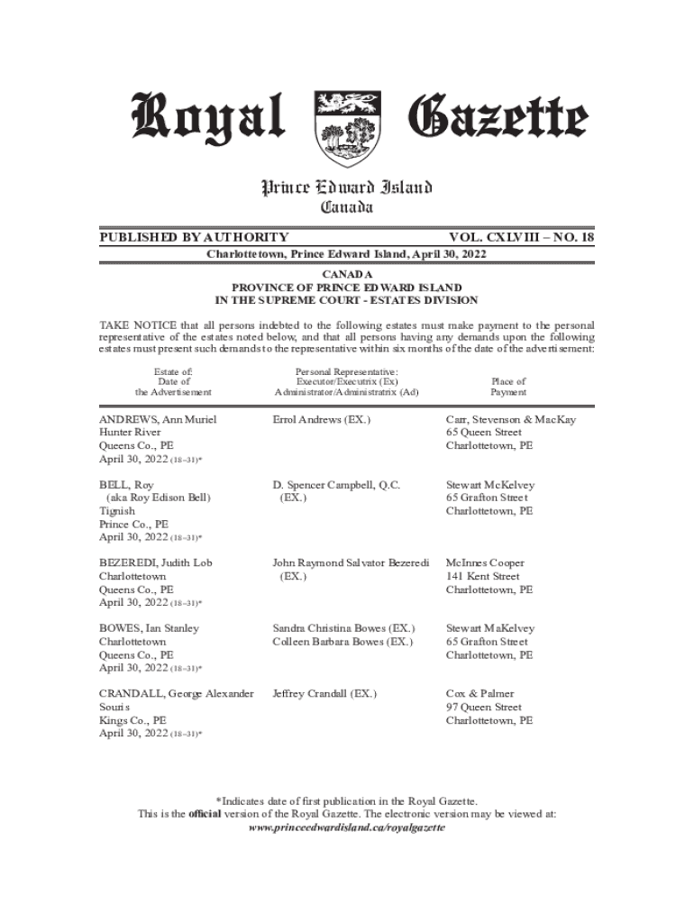 Prince Edward Island CanadaPUBLISHED BY AUTHORITY. CLVII NO. 18Charlottetown, Prince Edward Island, April 30, 2022, CANADA PROVINCE OF PRINCE EDWARD ISLAND IN THE SUPREME COURT ESTATES DIVISION TAKE