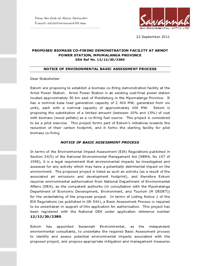 From the desk of Alicia Gender Email: alicia@savannahSA.com ___ 22 September 2011PROPOSED BIOMASS COVERING DEMONSTRATION FACILITY AT ARNO POWER STATION, MPUMALANGA PROVINCE DEA Ref No. 12/12/20/2380NOTICE