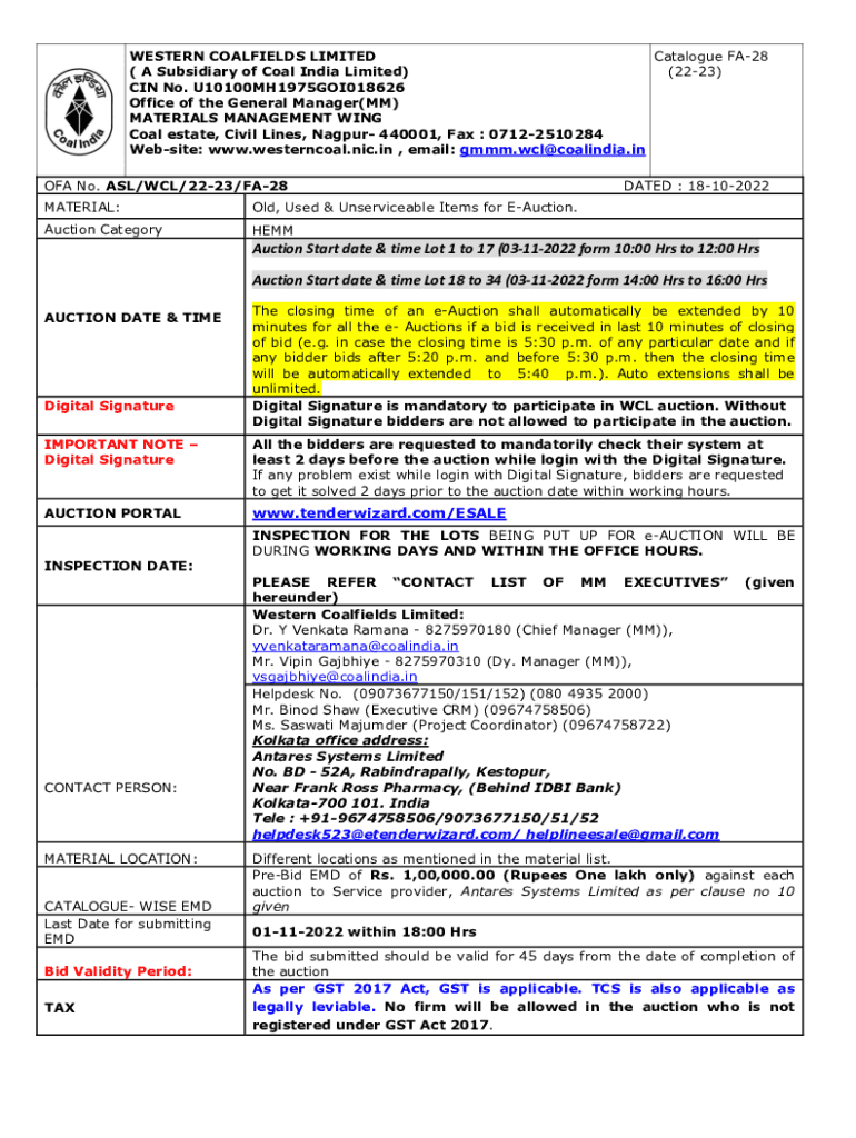 WESTERN COALFIELDS LIMITED Catalog FA28 (A Subsidiary of Coal India Limited) (2223) IN No. U10100MH1975GOI018626 Office of the General Manager(MM) MATERIALS MANAGEMENT WING Coal estate, Civil Lines,