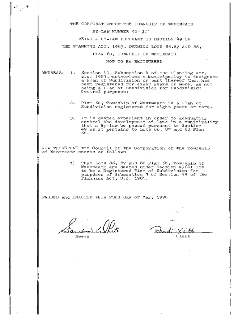 THE CORPORATION:of THE TOWNSHIP OF VESTMENTS BYLAW NUMBER 90 .ll\' BEING A BYLAW PURSUANT TO SECTION 49 OF THE PLANNING ACT, 1983, DEEMING LOTS 86,87 AND 88, PLAN 60, TOWNSHIP OF VESTMENTS NOT TO