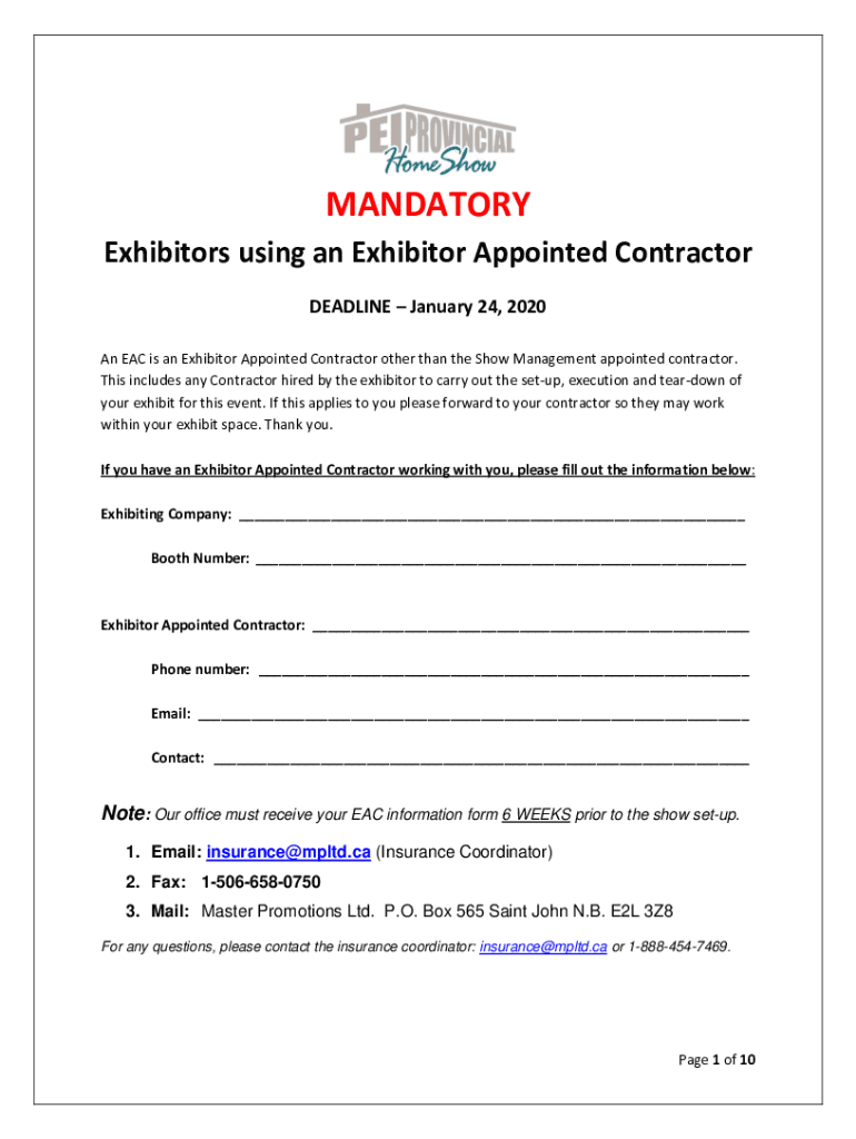 MANDATORY Exhibitors using an Exhibitor Appointed Contractor DEADLINE January 24, 2020, An EAC is an Exhibitor Appointed Contractor other than the Show Management appointed contractor. This includes