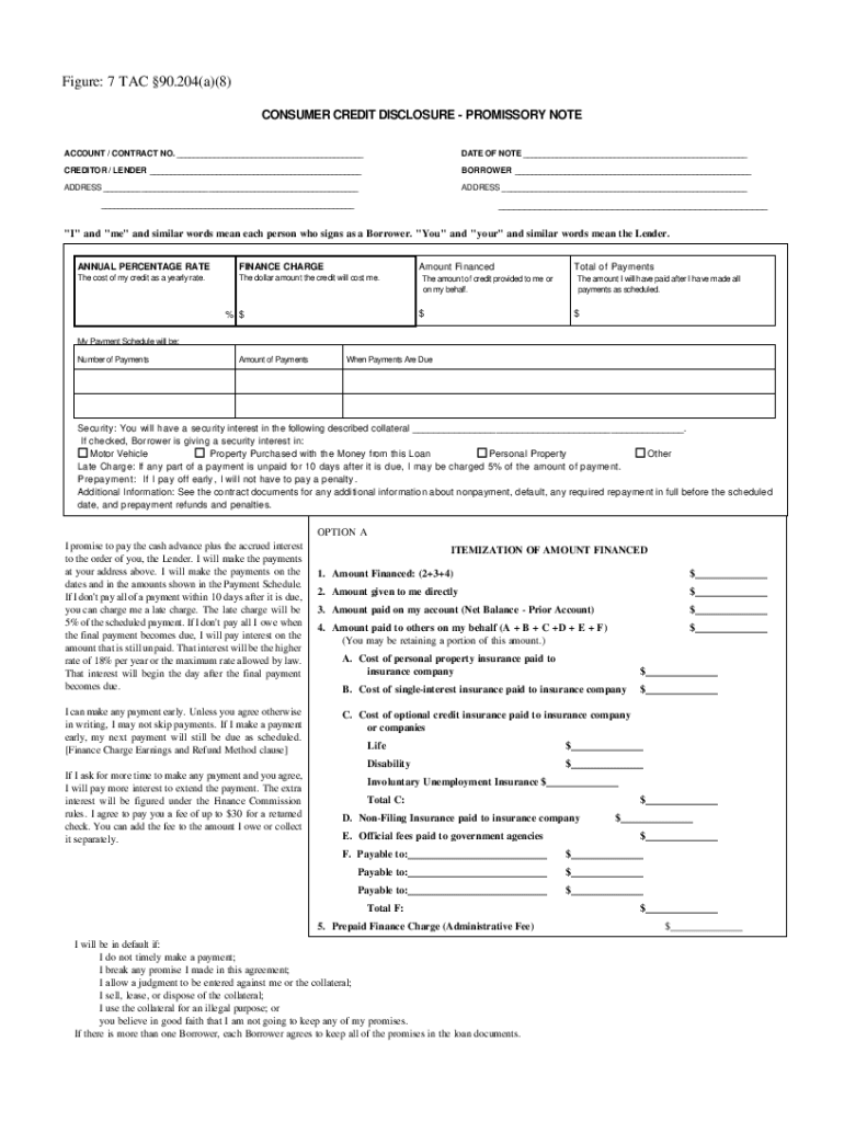 Figure: 7 TAC 90.204(a)(8) CONSUMER CREDIT DISCLOSURE PROMISSORY NOTE ACCOUNT / CONTRACT NO. ___DATE OF NOTE ___CREDITOR / LENDER ___BORROWER ___ADDRESS ___ADDRESS _________\”I\” and \”me\”