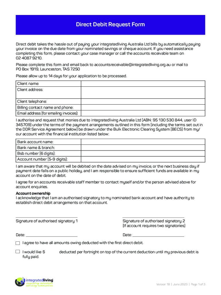 Direct Debit Request Form Direct debit takes the hassle out of paying your integrated living Australia Ltd bills by automatically paying your invoice on the due date from your nominated savings or