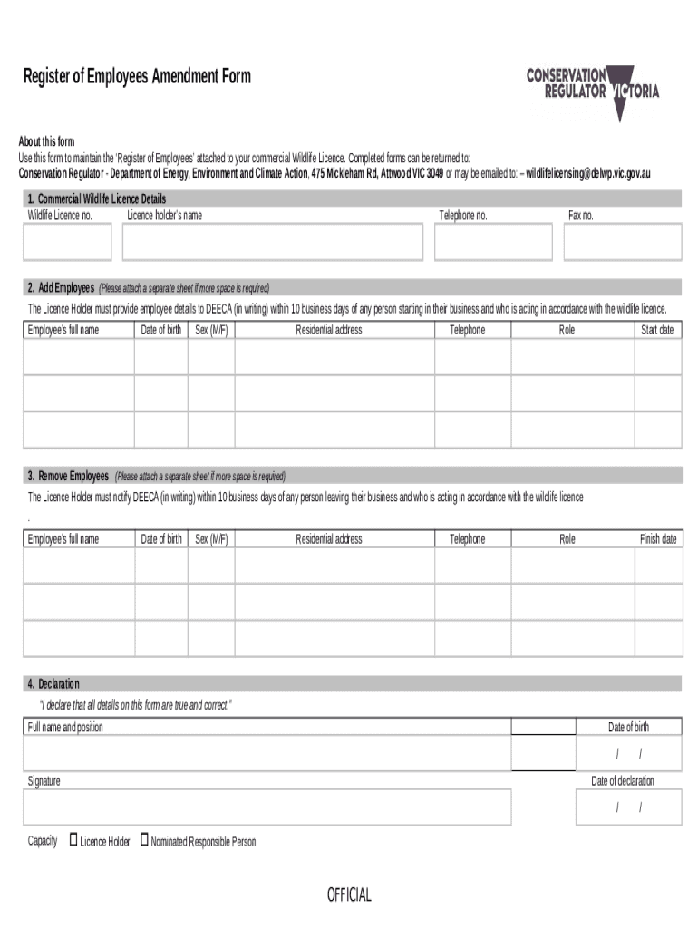 The Register of Employees Amendment is a document that should be submitted to the relevant address in order to provide some information. It needs to be completed and signed, which is possible manually, or with a particular solution like PDFfiller. This tool allows to fill out any PDF or Word document directly from your browser (no software requred), customize it according to your requirements and put a legally-binding e-signature. Right after completion, you can send the Register of Employees Amendment to the relevant receiver, or multiple individuals via email or fax. The blank is printable too because of PDFfiller feature and options offered for printing out adjustment. Both in electronic and physical appearance, your form will have a organized and professional appearance. You can also save it as the template to use it later, without creating a new file from scratch. All that needed is to edit the ready form.