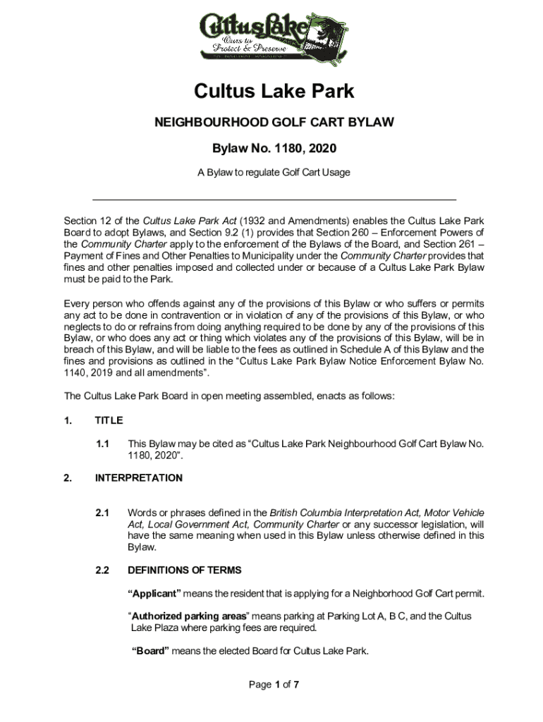 Cults Lake Park Neighborhood GOLF CART BYLAW No. 1180, 2020 A Bylaw to regulate Golf Cart Usage ___ Section 12 of the Cults Lake Park Act (1932 and Amendments) enables the Cults Lake Park Board to