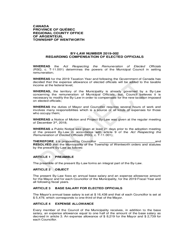 CANADA PROVINCE OF QUEBEC REGIONAL COUNTY OFFICE OF ARGENTEUIL TOWNSHIP OF WENTWORTHBYLAW NUMBER 2019002 REGARDING COMPENSATION OF ELECTED OFFICIALS WHEREAS the Act Respecting the Remuneration of