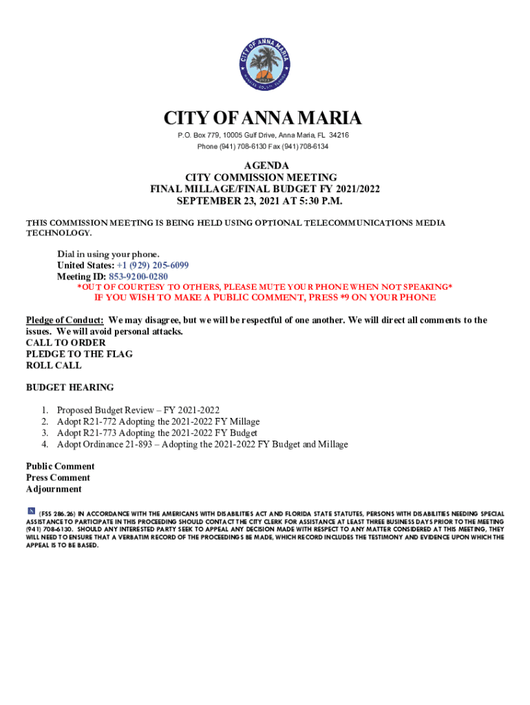 CITY OF ANNA MARIA P.O. Box 779, 10005 Gulf Drive, Anna Maria, FL 34216 Phone (941) 7086130 Fax (941) 7086134AGENDA CITY COMMISSION MEETING FINAL MILLAGE/FINAL BUDGET FY 2021/2022 SEPTEMBER 23, 2021,