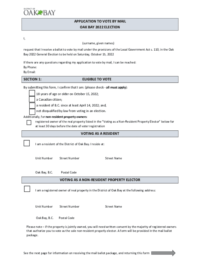 APPLICATION TO VOTE BY MAIL OAK BAY 2022 ELECTION I, (surname, given names) request that I receive a ballot to vote by mail under the provisions of the Local Government Act s. 110, in the Oak Bay