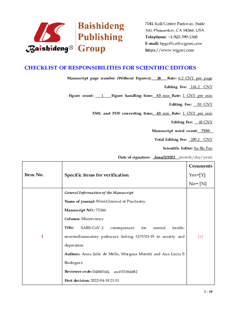 CHECKLIST OF RESPONSIBILITIES FOR SCIENTIFIC EDITORS Manuscript page number (Without Figures):Rate: 6.2 CNY per page26Editing Fee: 161.2 Figure count:1Figure handling time:83 min Rate: 1 CNY per min