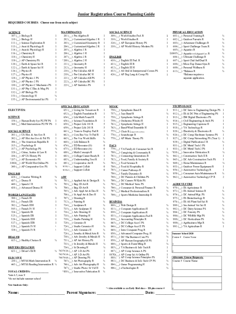 Junior Registration Course Planning Guide REQUIRED COURSES: Choose one from each subject SCIENCE 107 (__) 110 (__) 111 (__) 113 (__) 114 (__) 116 (__) 118 (__) 119 (__) 120 (__) 122 (__) 126 (__)