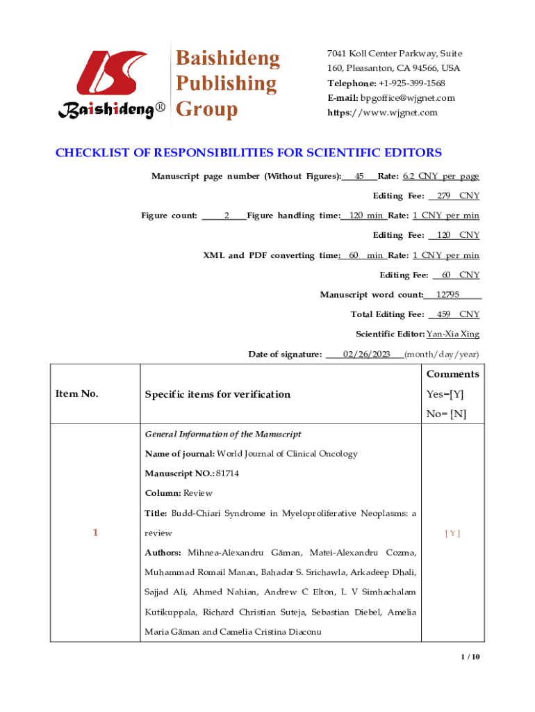 7041 Kill Center Parkway, Suite 160, Pleasant on, CA 94566, USA Telephone: +19253991568 Email: bpgoffice@wjgnet.com https://www.wjgnet.comCHECKLIST OF RESPONSIBILITIES FOR SCIENTIFIC EDITORS Manuscript