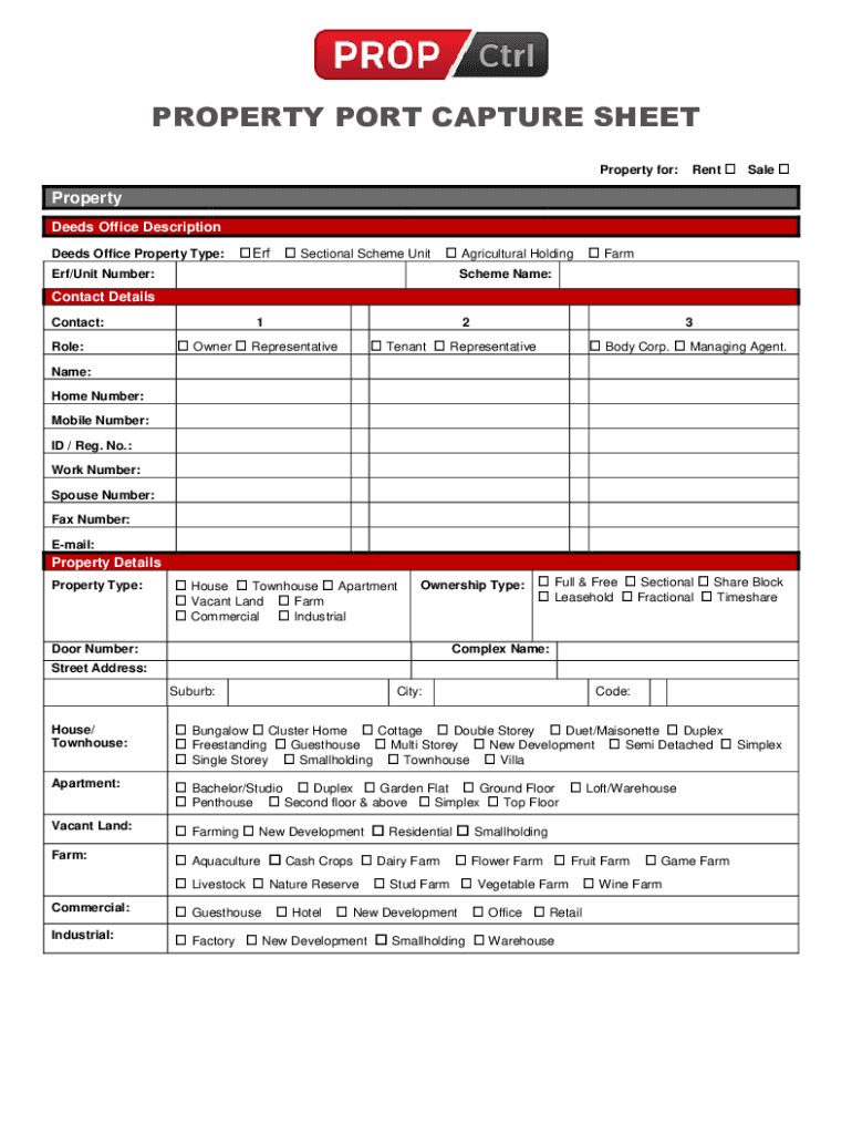 1PROPERTY PORT CAPTURE SHEET Property for:Rent Sale Property Deeds Office Description Deeds Office Property Type:ERF Sectional Scheme Unit Agricultural Holding/Unit Number: FarmScheme Name:Contact