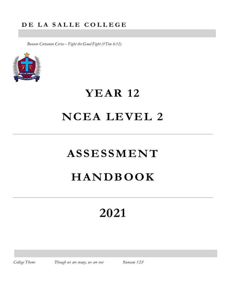 DE LA SALLE COLLEGE Bonus Cert amen Berta Fight the Good Fight (1Tim 6:12)YEAR 12 NC E A L E V EL 2ASSESSMENT H A N DB OOK2021College Wherethrough we are many, we are one Romans 12:5Assessment Procedures