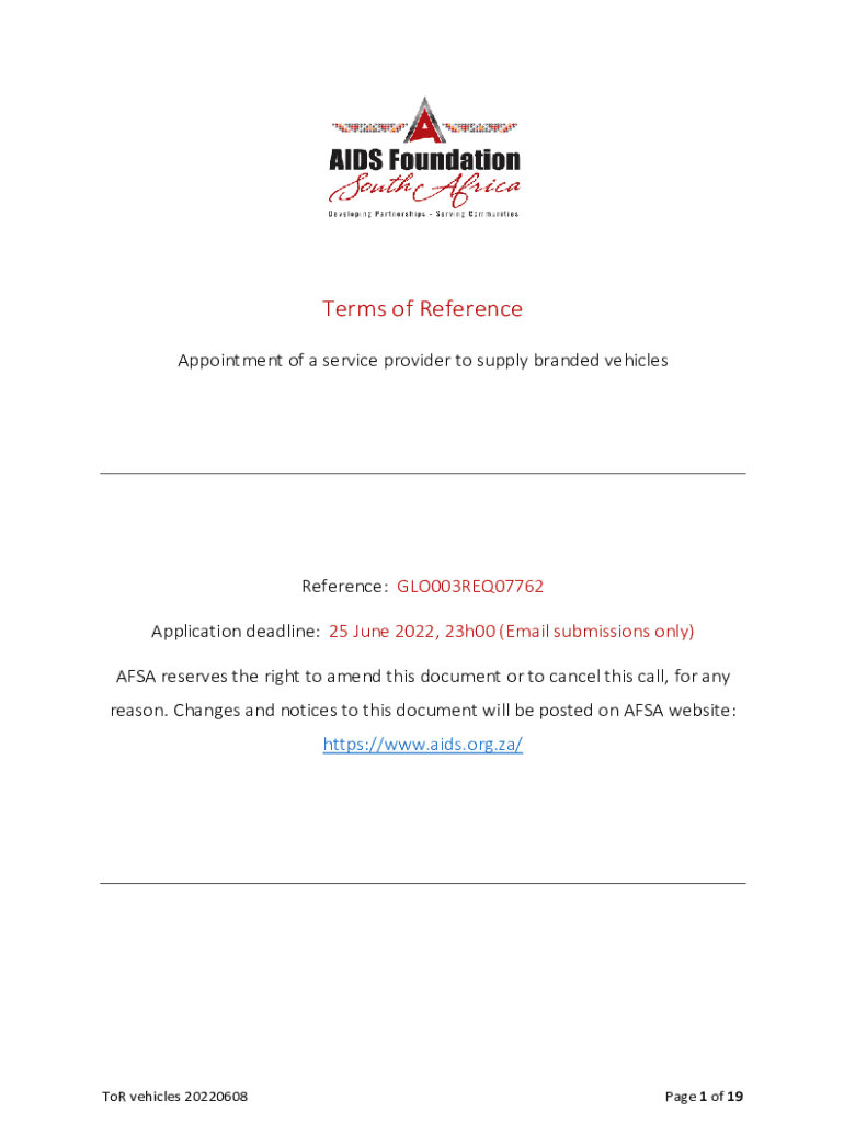 Terms of Reference Appointment of a service provider to supply branded vehiclesReference: GLO003REQ07762 Application deadline: 25 June 2022, 23h00 (Email submissions only) FSA reserves the right to