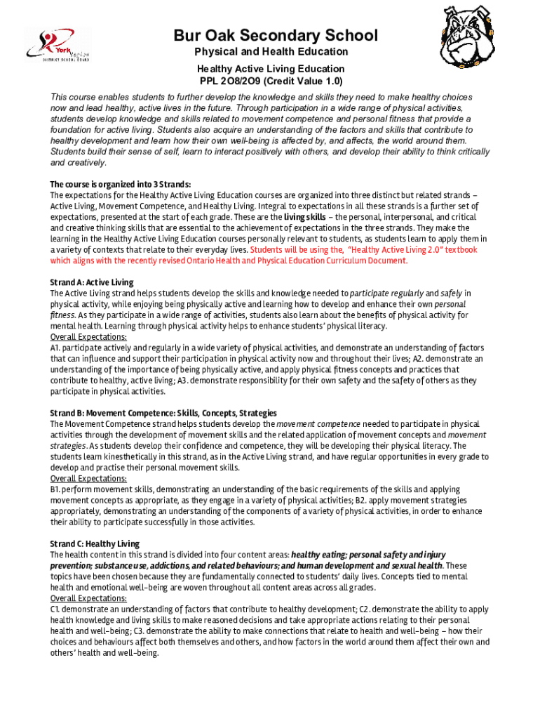 Bur Oak Secondary School Physical and Health Education Healthy Active Living Education PPL 2O8/2O9 (Credit Value 1.0) This course enables students to further develop the knowledge and skills they