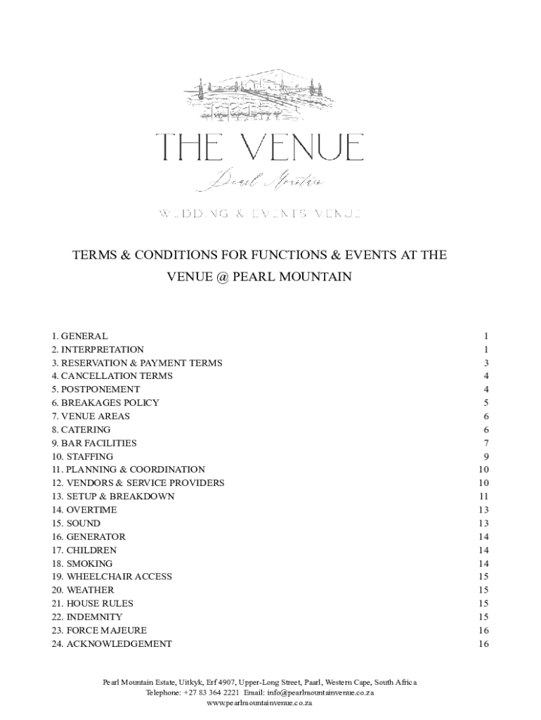 TERMS & CONDITIONS FOR FUNCTIONS & EVENTS AT THE VENUE @ PEARL MOUNTAIN1. GENERAL 2. INTERPRETATION 3. RESERVATION & PAYMENT TERMS 4. CANCELLATION TERMS 5. POSTPONEMENT 6. BREAKAGES POLICY 7. VENUE