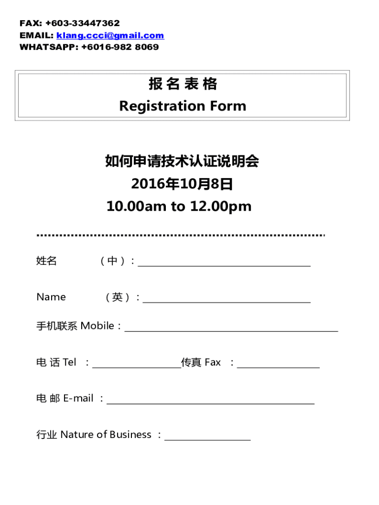 FAX: +60333447362 EMAIL: klang.ccci@gmail.com WhatsApp: +6016982 8069 Registration Form 2016108 10.00am to 12.00pm Name Mobile Tel Email Nature of Business Fax