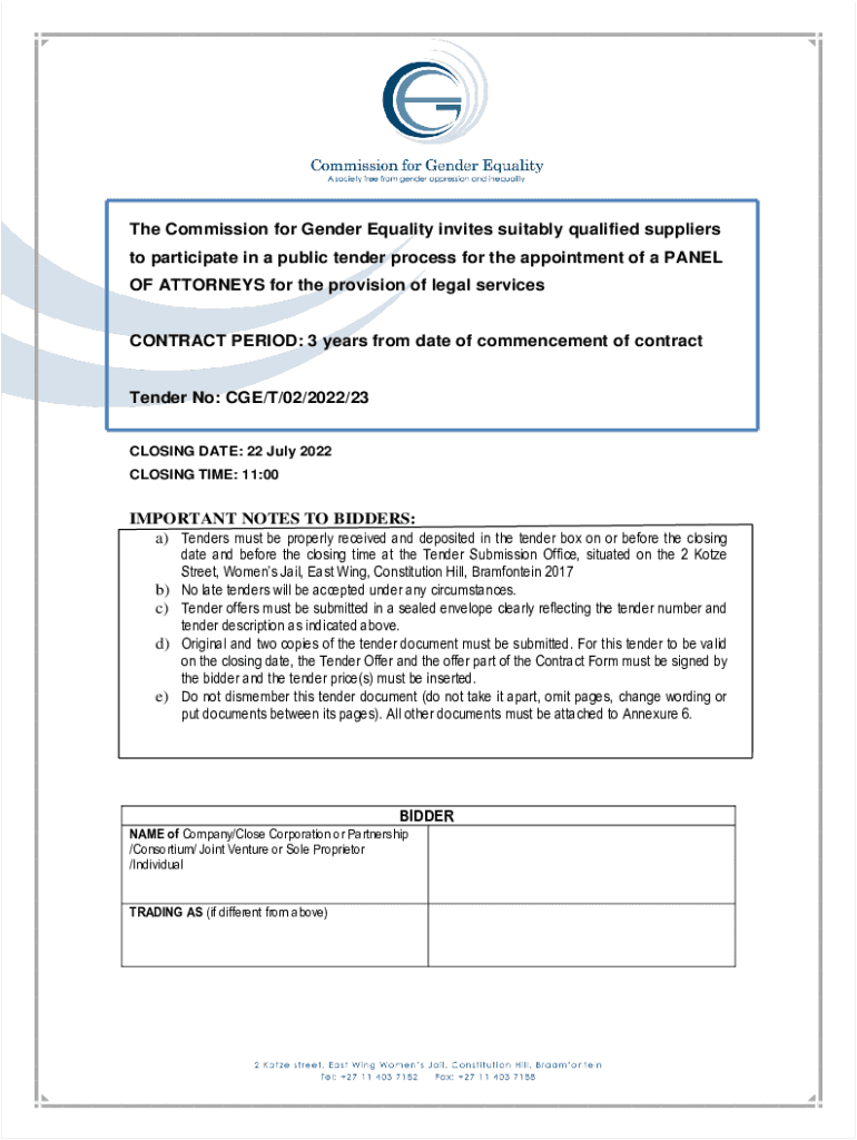The Commission for Gender Equality invites suitably qualified suppliers to participate in a public tender process for the appointment of a PANEL OF ATTORNEYS for the provision of legal servicesCONTRACT