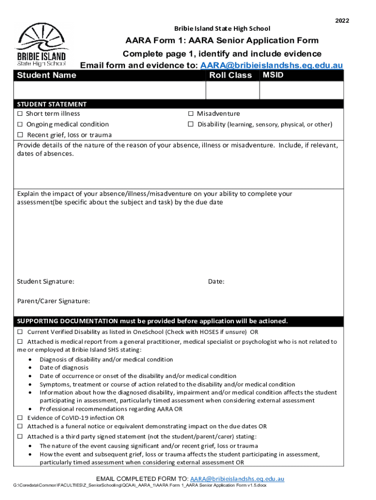 Bribe Island State High School2022AARA Form 1: SARA Senior Application Form Complete page 1, identify and include evidence Email form and evidence to: AARA@bribieislandshs.eq.edu.au Student Name Roll