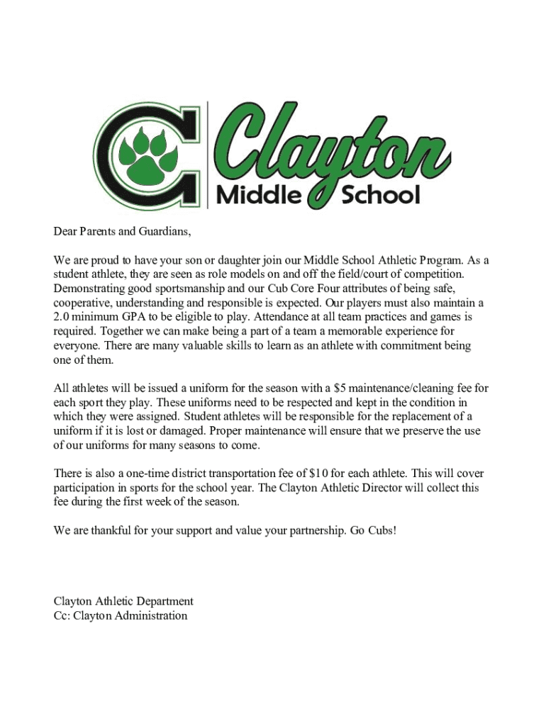 Dear Parents and Guardians, We are proud to have your son or daughter join our Middle School Athletic Program. As a student athlete, they are seen as role models on and off the field/court of competition.