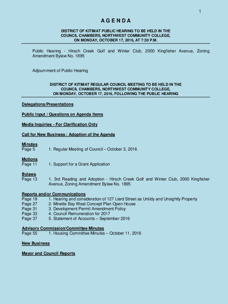 1AGENDA DISTRICT OF Kit Kat PUBLIC HEARING TO BE HELD IN THE COUNCIL CHAMBERS, NORTHWEST COMMUNITY COLLEGE, ON MONDAY, OCTOBER 17, 2016, AT 7:30 P.M. Public Hearing Hirsch Creek Golf and Winter Club,