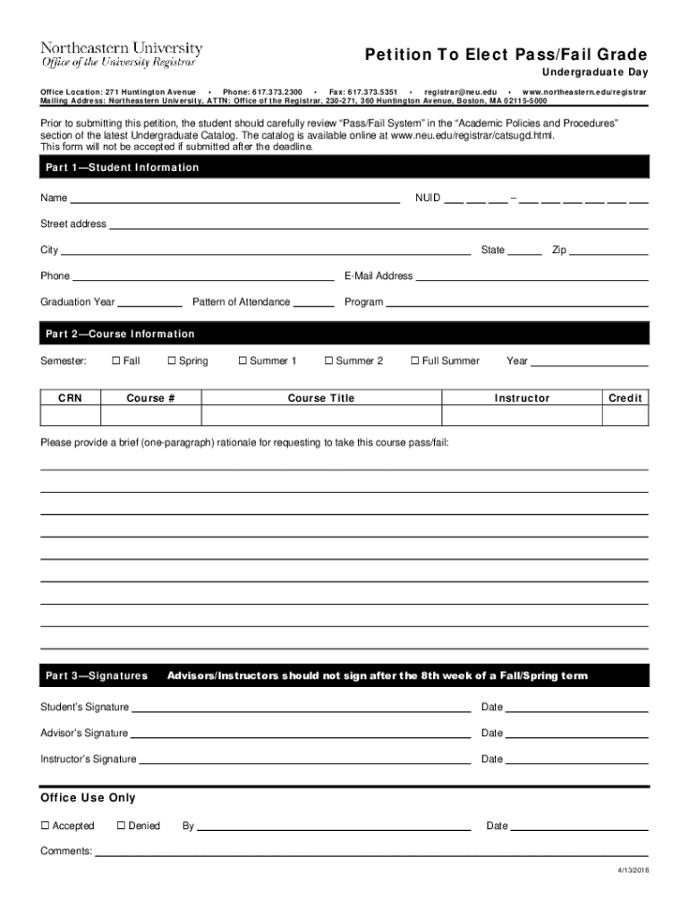 Petition To Elect Pass/Fail GradeUndergraduate Office Location: 271 Huntington Avenue