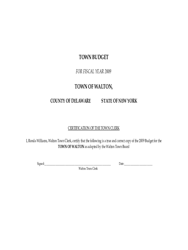 TOWN BUDGET FOR FISCAL YEAR 2009TOWN OF WALTON, COUNTY OF DELAWARESTATE OF NEW RECERTIFICATION OF THE TOWN CLERK I, Ronda Williams, Walton Town Clerk, certify that the following is a true and correct