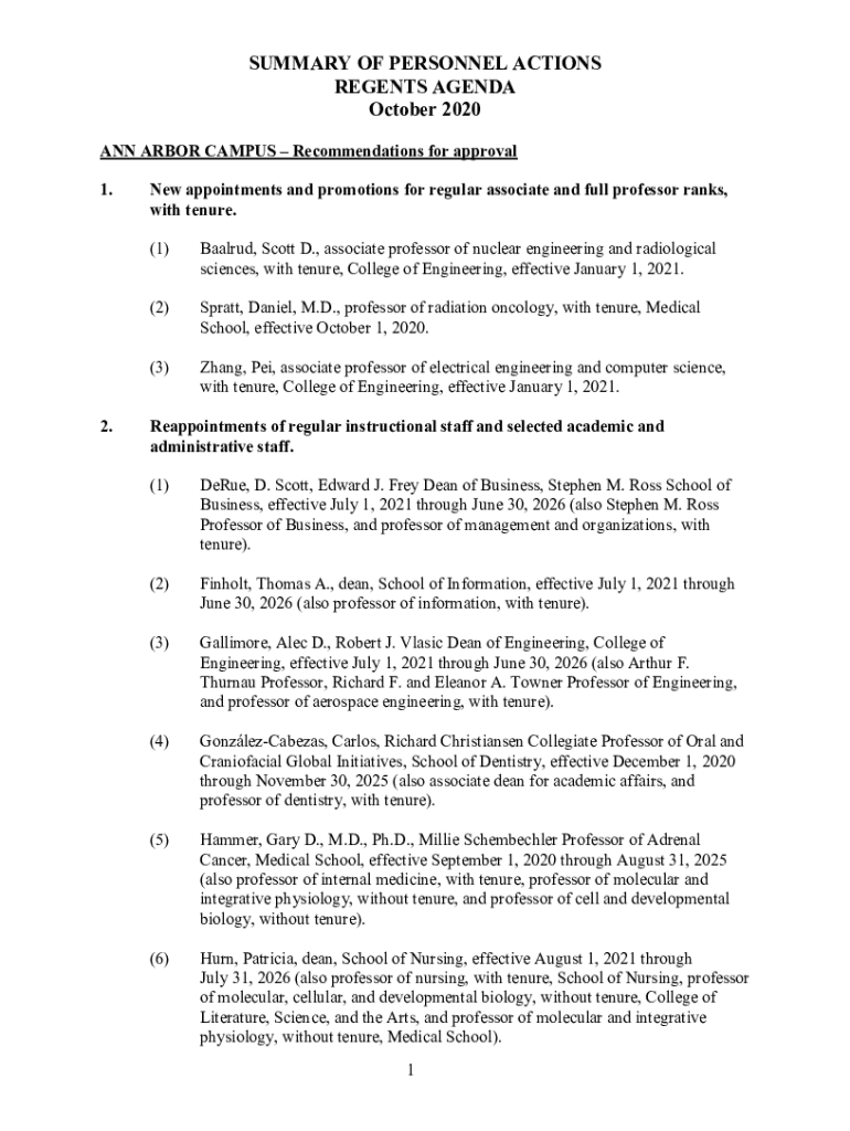 SUMMARY OF PERSONNEL ACTIONS REGENTS AGENDA October 2020 ANN ARBOR CAMPUS Recommendations for approval 1.2. New appointments and promotions for regular associate and full professor ranks, with tenure.