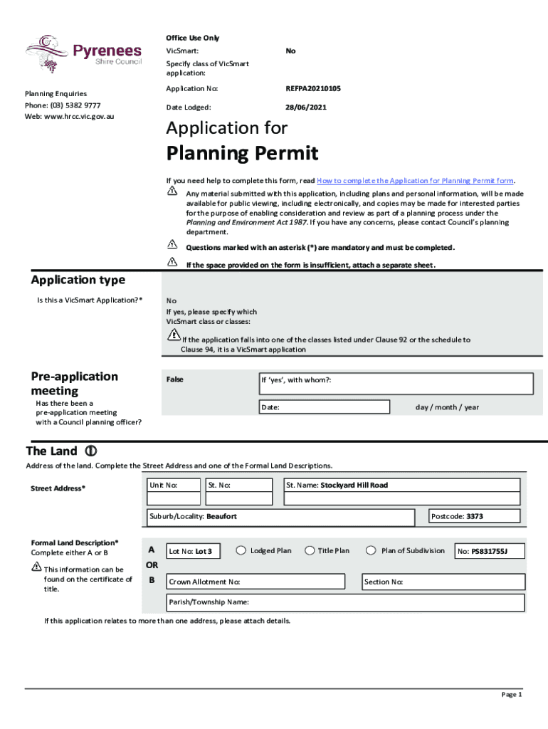 Office Use Only Smart:Specify class of Smart application: Planning Inquiries Phone: (03) 5382 9777 Web: www.hrcc.vic.gov.auApplication No:REFPA20210105Date Lodged:28/06/2021Application planning Permit