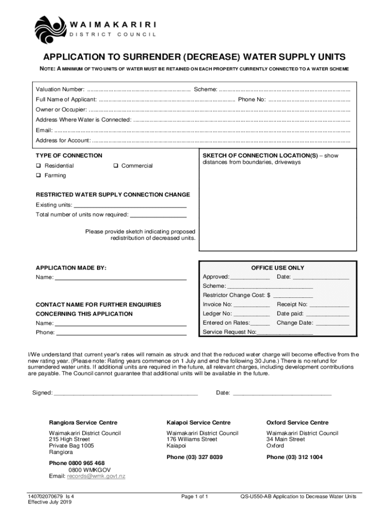 APPLICATION TO SURRENDER (DECREASE) WATER SUPPLY UNITS NOTE: A MINIMUM OF TWO UNITS OF WATER MUST BE RETAINED ON EACH PROPERTY CURRENTLY CONNECTED TO A WATER SCHEMEValuation Number: ...............................................................