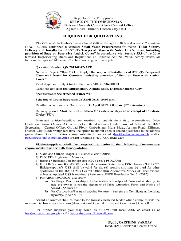 Republic of the Philippines OFFICE OF THE OMBUDSMAN Bids and Awards Committee Central Office Afar Road, Dalian, Quezon City 1104REQUEST FOR QUOTATIONS The Office of the Ombudsman Central Office, through