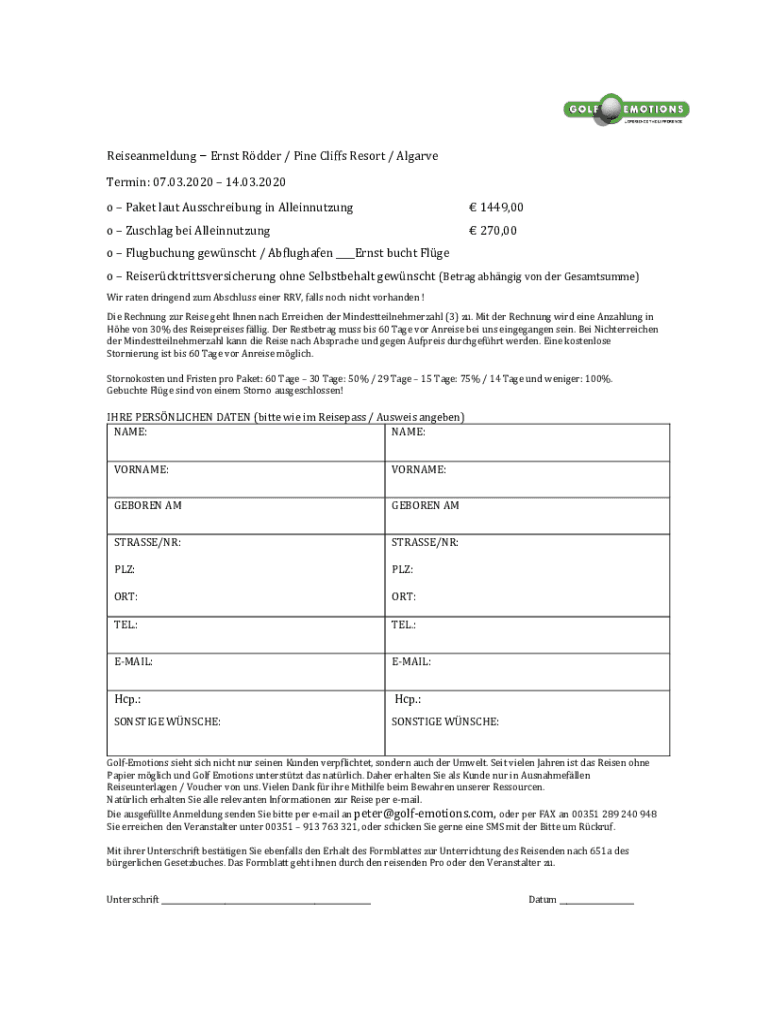 Reiseanmeldung Ernst Rider / Pine Cliffs Resort / AlgarveTermin: 07.03.2020 14.03.2020o Packet last Ausschreibung in Alleinnutzung 1449,00o Muscular BEI Alleinnutzungo Flugbuchung goons / Abflughafen