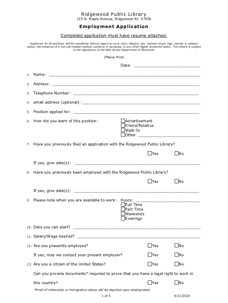 Ridge wood Public Library 125 N. Maple Avenue, Ridge wood NJ 07450Employment Application Completed application must have resume attached. Applicants for all positions will be considered without regard