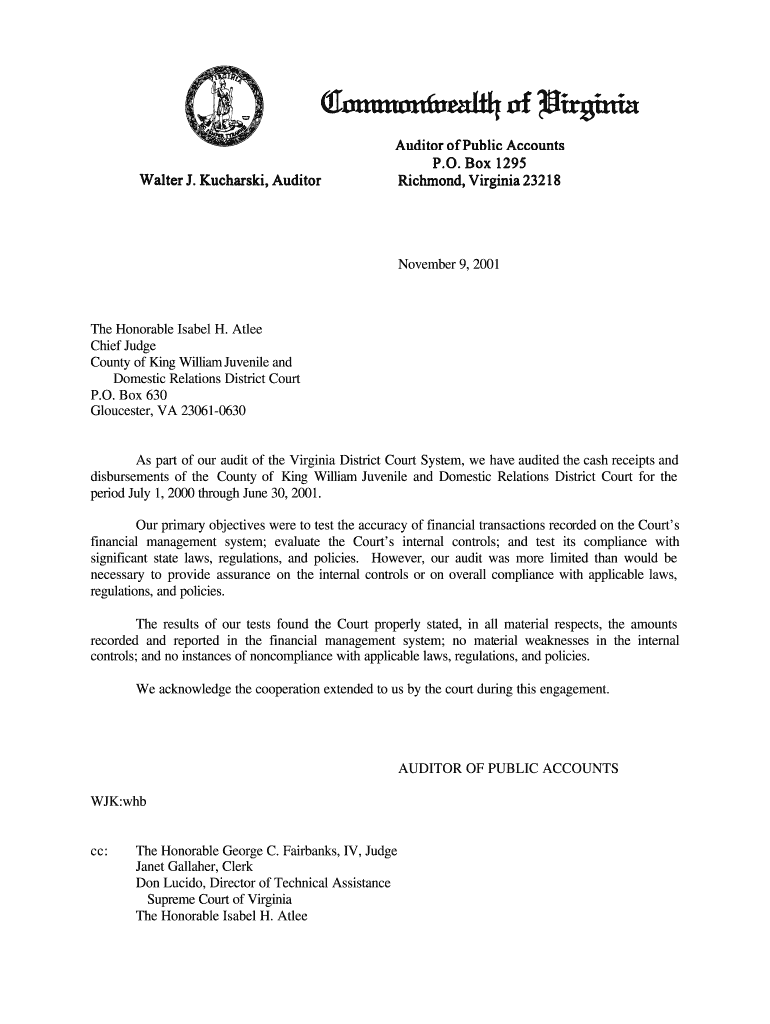 November 9, 2001, The Honorable Isabel H. Attlee Chief Judge County of King William Juvenile and Domestic Relations District Court P.O. Box 630 Gloucester, VA 23061-0630 As part of our audit of the