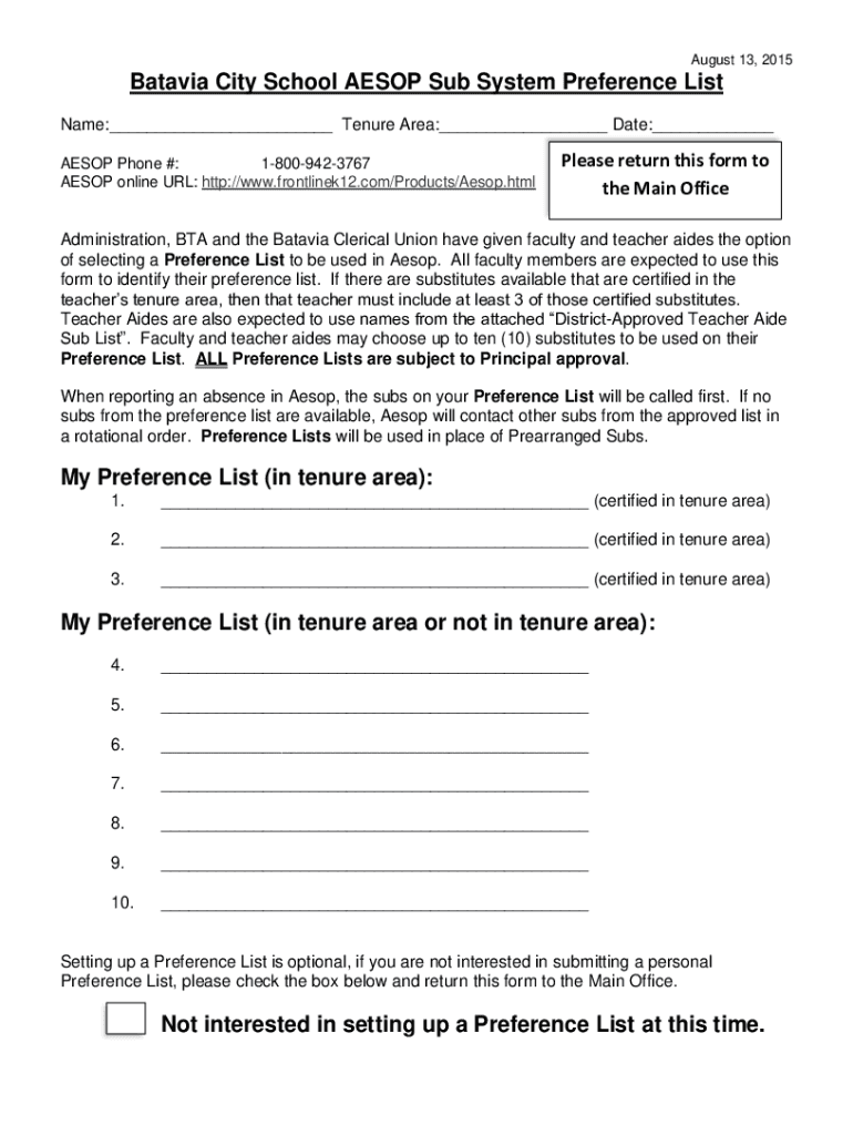 August 13, 2015Batavia City School AESOP Sub System Preference List Name:___ Tenure Area:___ Date:___ AESOP Phone #: 18009423767 AESOP online URL: http://www.frontlinek12.com/Products/Aesop.htmlPlease