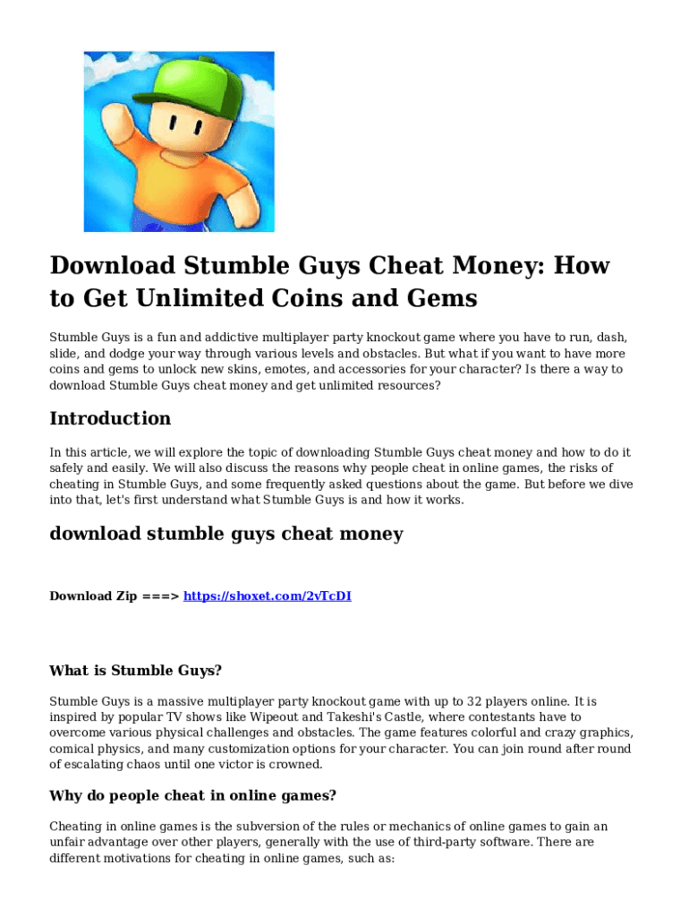 Download Stumble Guys Cheat Money: How to Get Unlimited Coins and Gems Stumble Guys is a fun and addictive multiplayer party knockout game where you have to run, dash, slide, and dodge your way through