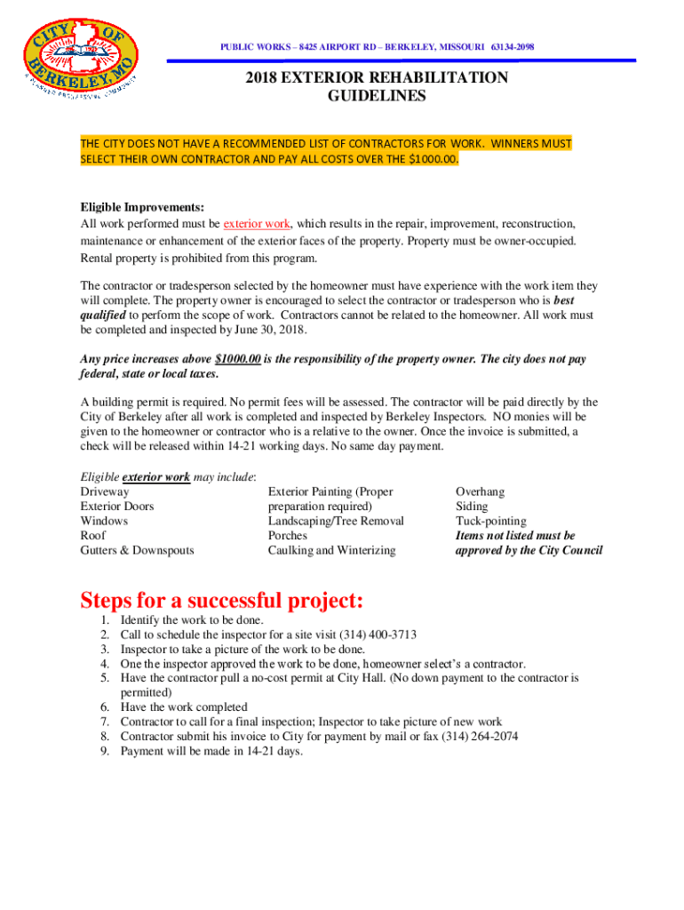 PUBLIC WORKS 8425 AIRPORT RD BERKELEY, MISSOURI 6313420982018 EXTERIOR REHABILITATION GUIDELINES THE CITY DOES NOT HAVE A RECOMMENDED LIST OF CONTRACTORS FOR WORK. WINNERS MUST SELECT THEIR OWN CONTRACTOR