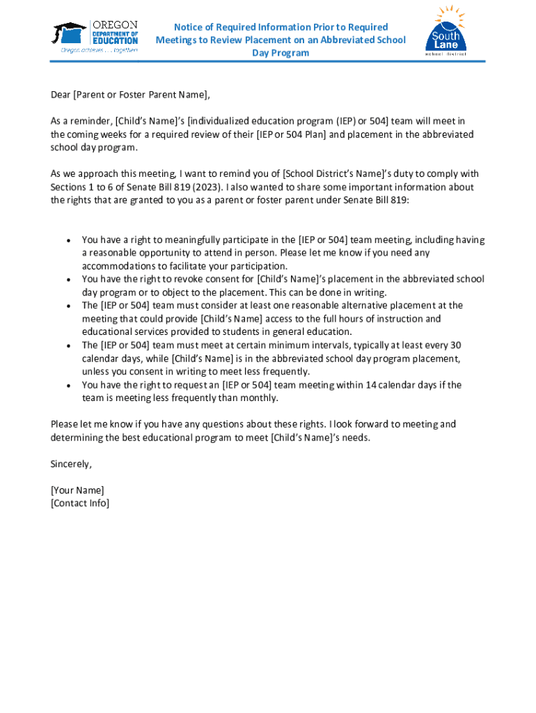 Notice of Required Information Prior to Required Meetings to Review Placement on an Abbreviated School Day Program Dear [Parent or Foster Parent Name], As a reminder, [Child's Name’s [individualized