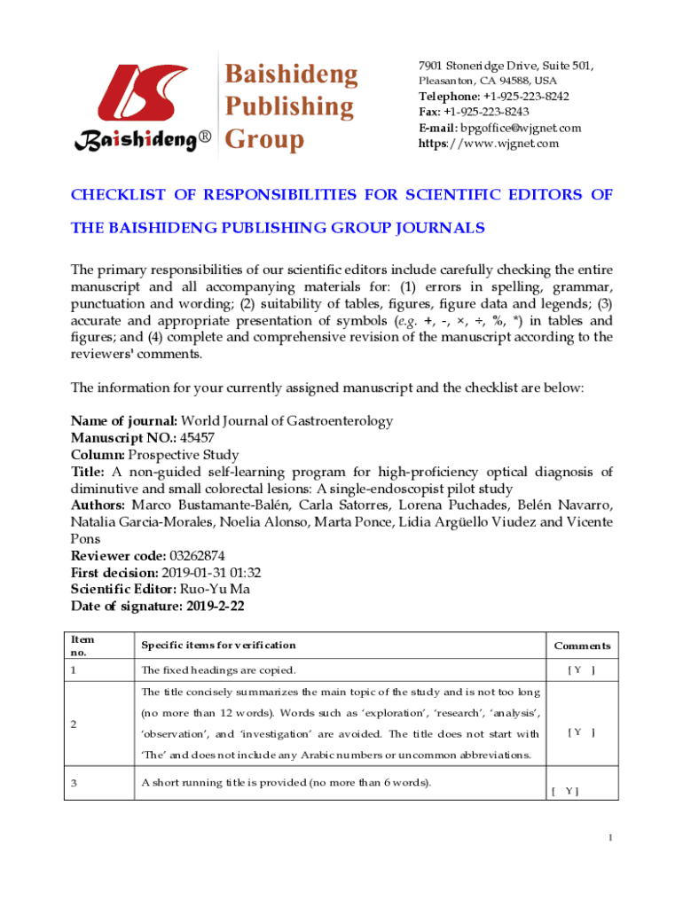 7901 Stone ridge Drive, Suite 501, Pleasant on, CA 94588, USA Telephone: +19252238242 Fax: +19252238243 Email: bpgoffice@wjgnet.com https://www.wjgnet.comCHECKLIST OF RESPONSIBILITIES FOR SCIENTIFIC