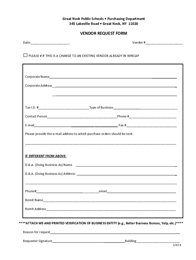 Great Neck Public Schools Purchasing Department 345 Lakeville Road Great Neck, NY 11020VENDOR REQUEST FORM Date:___Vendor #___PLEASE IF THIS IS A CHANGE TO AN EXISTING VENDOR ALREADY IN WINCAPCorporate