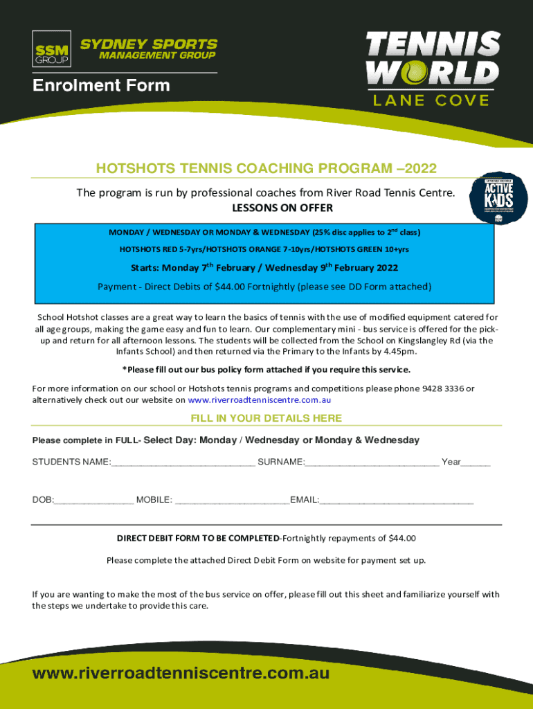 HOTSHOTS TENNIS COACHING PROGRAM 2022 The program is run by professional coaches from River Road Tennis Center. LESSONS ON OFFER MONDAY / WEDNESDAY OR MONDAY & WEDNESDAY (25% disc applies to 2nd class)