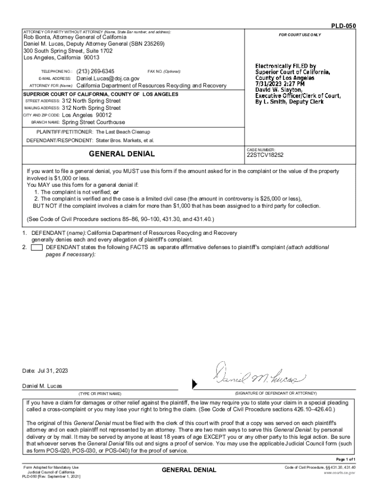PLD050 ATTORNEY OR PARTY WITHOUT ATTORNEY (Name, State Bar number, and address):FOR COURT USE ONLY Rob Bonita, Attorney General of California Daniel M. Lucas, Deputy Attorney General (SON 235269)