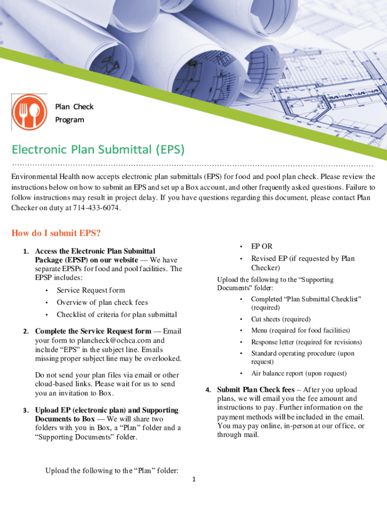 Environmental Health now accepts electronic plan submittals (EPS) for food and pool plan check. Please review the instructions below on how to submit an EPS and set up a Box account, and other frequently