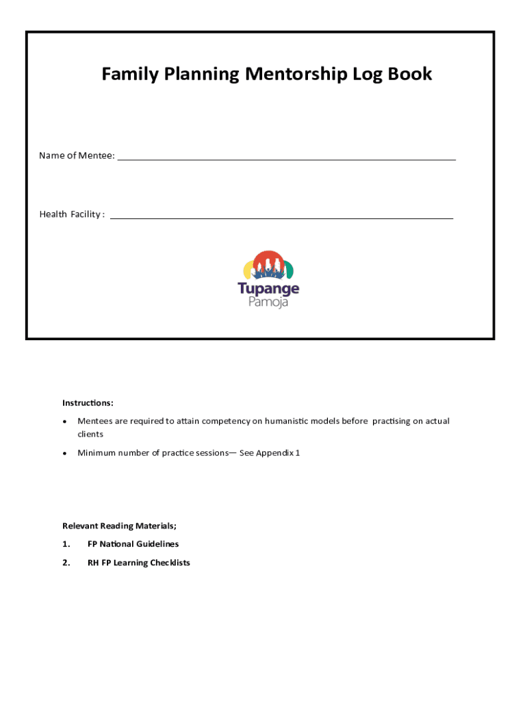 Family Planning Mentorship Log Bookcase of Mentee: ___Health Facility : ___Instructions: Mentees are required to attain competency on humanistic models before practicing on actual clientsMinimum number