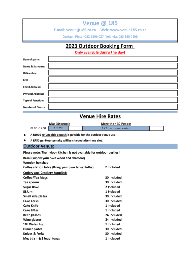 Venue @ 185 Email: venue@185.co.zaWeb: www.venue185.co.zaContact: Peter 082 5565 027 Yolanda: 083 280 06082023 Outdoor Booking Form Only available during the day! Date of party: Name & Surname: ID