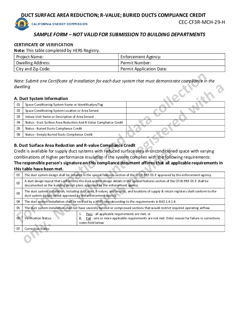 DUCT SURFACE AREA REDUCTION; VALUE; BURIED DUCTS COMPLIANCE CREDIT CECCF3RMCH29H SAMPLE FORM NOT VALID FOR SUBMISSION TO BUILDING DEPARTMENTS CERTIFICATE OF VERIFICATION Note: This table completed