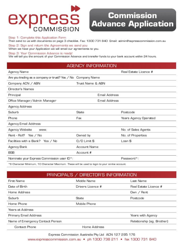 ExpressCommission Advance ApplicationCOMMISSIONStep 1: Complete this Application Former send to us with documents on page 3 checklist. Fax: 1300 731 840 Email: admin@expresscommission.com.auStep 2: