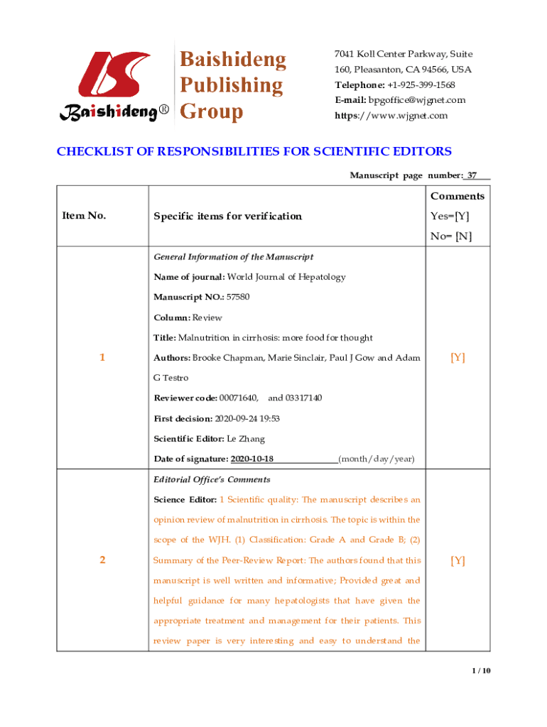 7041 Kill Center Parkway, Suite160, Pleasant on, CA 94566, USA Telephone: +19253991568 Email: bpgoffice@wjgnet.com https://www.wjgnet.comCHECKLIST OF RESPONSIBILITIES FOR SCIENTIFIC EDITORS Manuscript