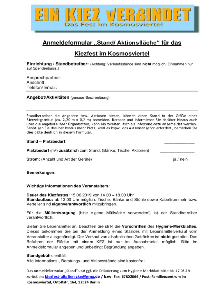 Holen Sie sich kostenlos Anmeldeformular Stand/ Aktionsflche fr das Kiezfest im ...