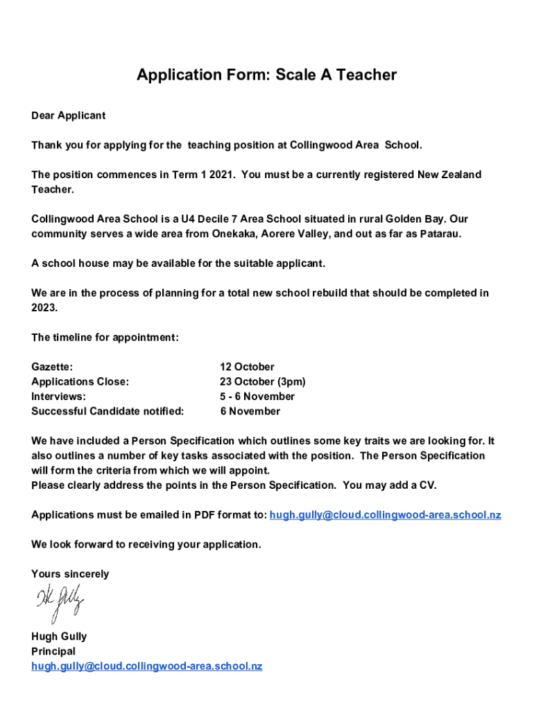 Application Form: Scale A Teacher Dear Applicant Thank you for applying for the teaching position at Collingwood Area School. The position commences in Term 1 2021. You must be a currently registered